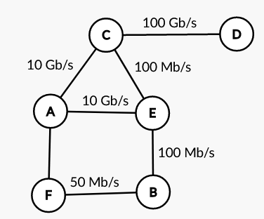 On rappelle que le coût d’une liaison est donné par la formule suivante : cout = 108/d, où d est la bande passante (en bits/s) entre 2 routeurs. On rappelle aussi que : 1Gb/s = 1000 Mb/s = 109 bits/s.